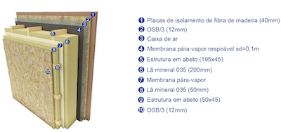 A parede exterior Norges Hus, tem fachada exterior ventilada, hidrófuga e resistência ao fogo até 90mins, isolamento de alta densidade com 250mm de espessura e estrutura de madeira certificada C24.