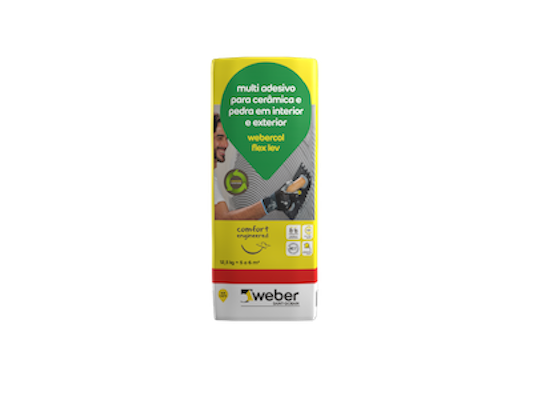O webercol flex lev é a primeira argamassa com metade do peso para o mesmo rendimento, facilita o transporte e reduz os seus custos. Pesa 12,5kg, é composto por mais de 30% de materiais reciclados e necessita de um menor esforço para a sua aplicação e manuseamento.